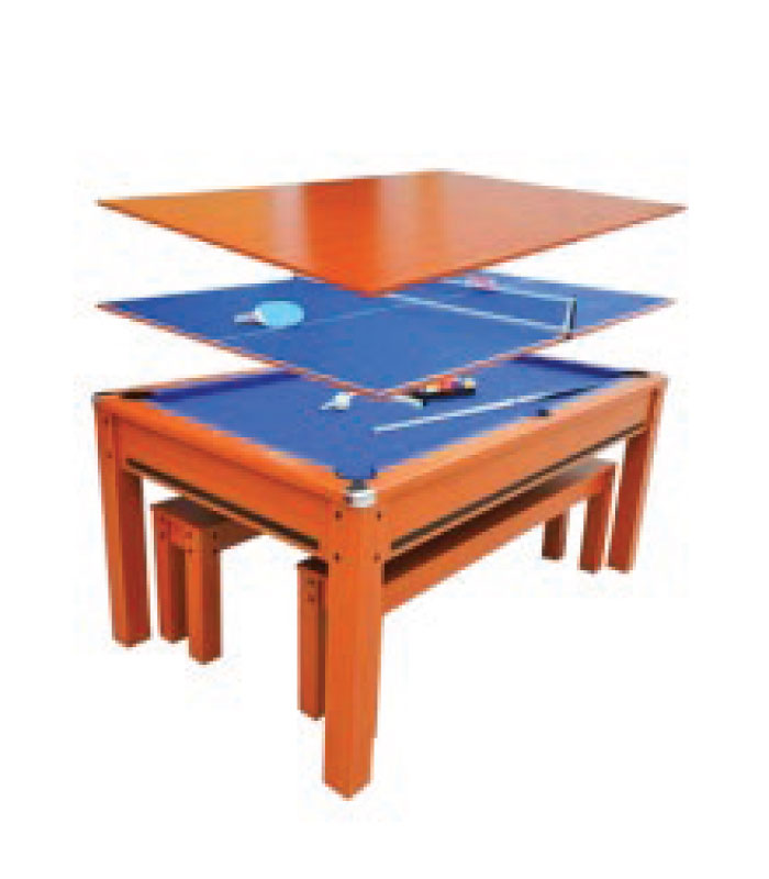 A versatile 3-in-1 table combining pool, table tennis, and a dining/working surface. Comes with benches and complete accessories.